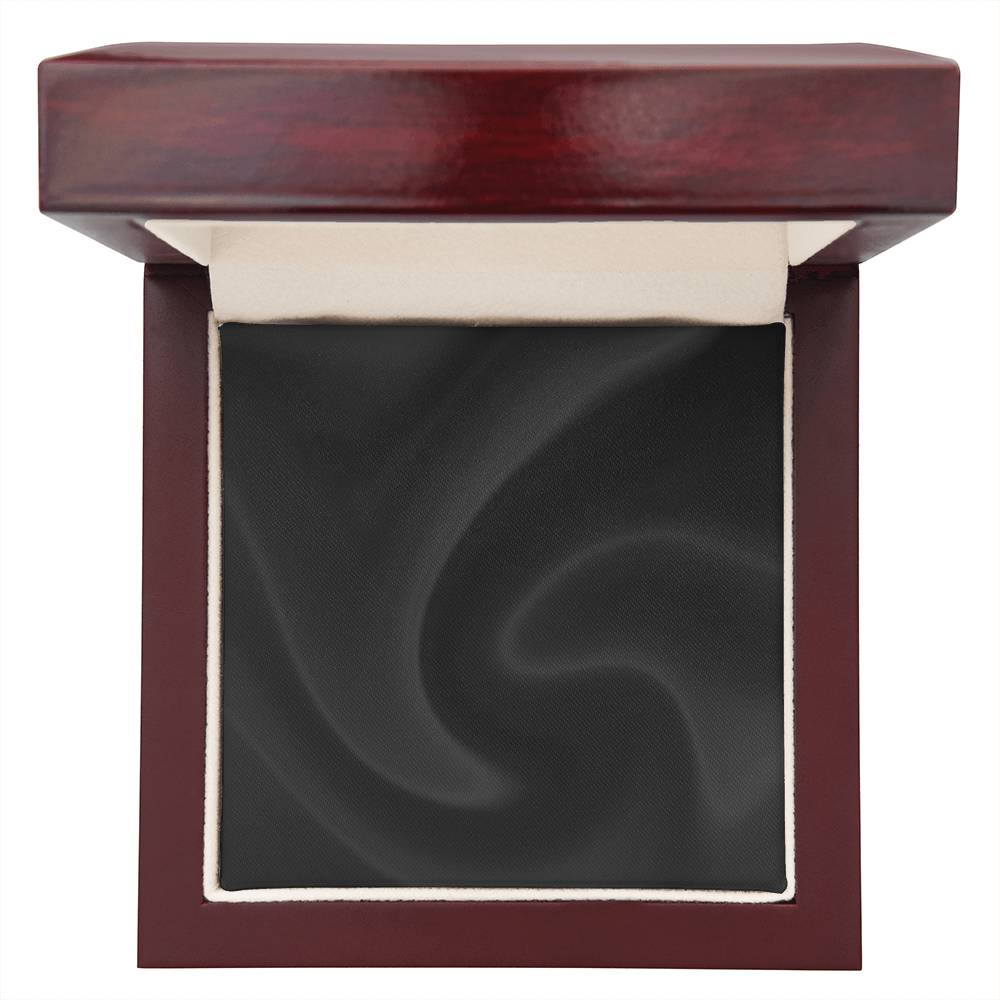 Your piece is lovingly packaged in a complimentary soft touch box for easy gifting. Elevate your presentation by upgrading to the mahogany style luxury box, which features a brilliant LED spotlight.